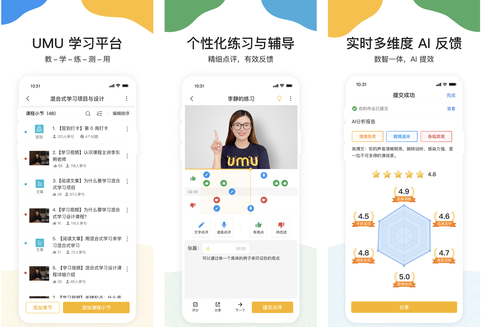 UMU 创始了一种新的学习方法,经过 AI 技能供给“视频操练、AI 教导与反应”,职工经过重复、距离操练,依据 AI 反应继续优化和提高自己的体现,构成肌肉回忆,然后应用到作业场景中,打破了传统练习与事务场景脱节的窘境,真实完成学以致用,一起许多节省了企业讲师的生产力。