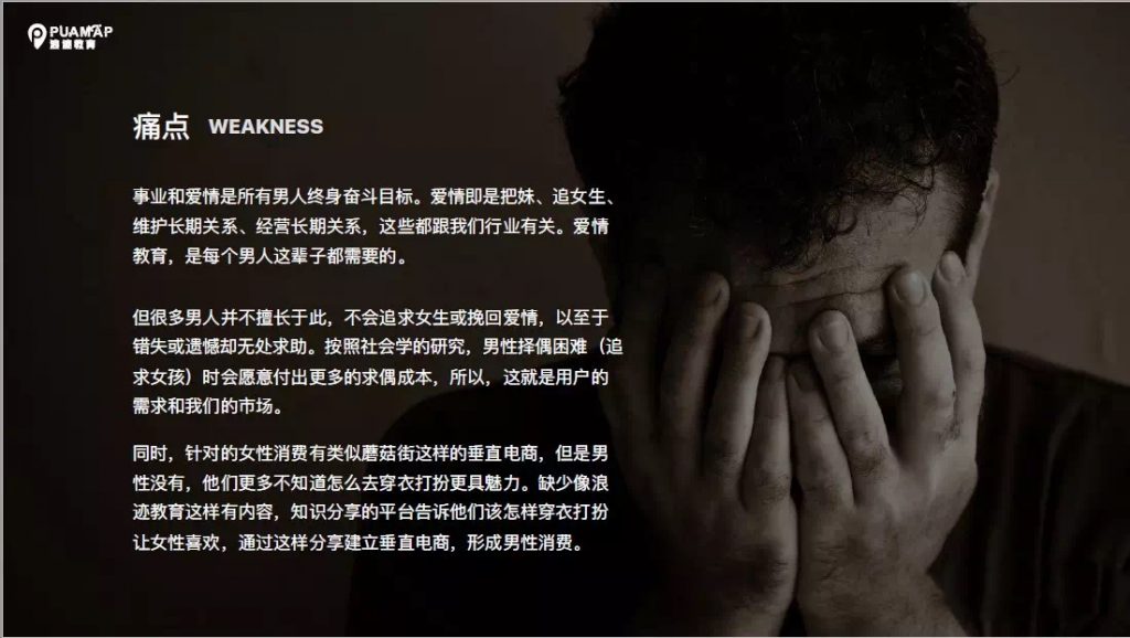 首先在初衷上,浪迹情感就把男生和女生剥离开来,将男生放在一个弱势的求偶位置上。将“把妹”放在需求痛点中,而不是获取一段安稳健康的爱情。这更像是一个教男生“打猎”的训练,一场假装的游戏。
