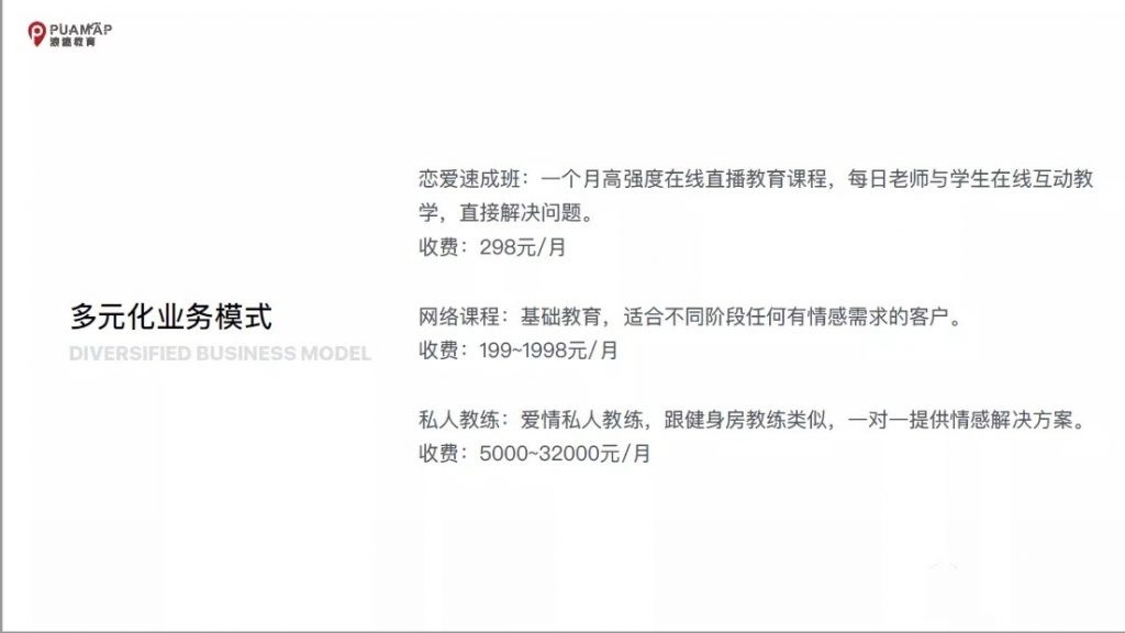 再来看浪迹情感的商业形式,“多元化事务形式”显现,公司有爱情速成班、网络课程、私家教练、线下课程、拯救服务、门徒等不同形式,从每月298的贱价客群、到每月10万的高客单价集体通吃,还供给服饰、游戏、视频节目制造等周边配套产品。